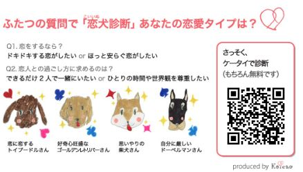たった2問だから簡単、ちょっとした話題づくりにイイカモね~無料だし。 プードル・レトリバー・柴犬・ドーベルマンの4つに分けられる 私としては、プードル可愛いけど柴犬がいいなぁ(思いやりの柴犬) 結果は!! 自分に厳しい うーん、ちょっと当たっているかも~恋愛体質ではないね… 恋愛は、素直が一番だと思うがなかなか難しい…ドーベルマンですから~~ そんなこんなで晩婚です(笑) 恋帳・恋犬診断URL(携帯のみ閲覧可能です) ![]()